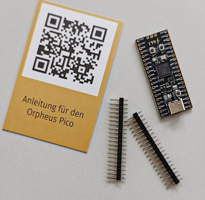 Der Orpheus Pico wird zusammen mit deiner Urkunde verschickt. Im Paket enthalten: Orpheus Pico und zwei Steckleisten (Pin Header).