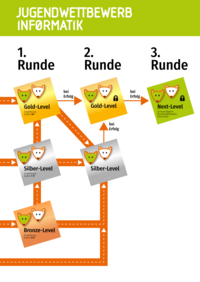 - Für das Gold-Level der 2. Runde qualifiziert man sich über eine erfolgreiche Teilnahme am Gold-Level der 1. Runde (Mindestens eine Auszeichnung erreicht) oder am Silber-Level der 2. Runde (Mindestens 10 Punkte erreicht).