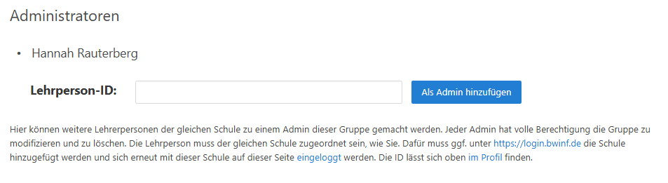 - Hinweis: Als Administrator kann nur eine Lehrkraft der eigenen Schule hinzugefügt werden.