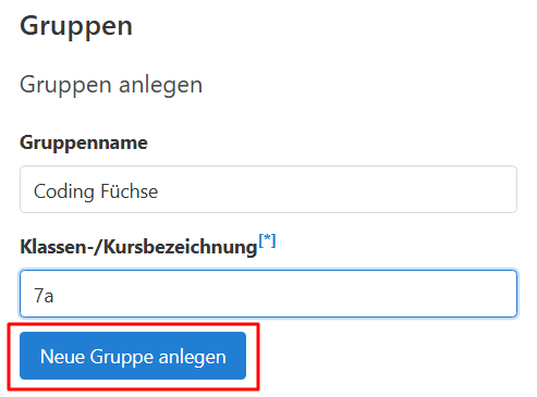 - Wichtig: Dieser Gruppencode dient der einmaligen Registrierung der SuS. Für die zukünftigen Anmeldungen nutzen die SuS ihren persönlichen Logincode. Wird mehrfach der Gruppencode eingegeben, so wird jedes Mal ein Account erstellt (existiert bereits ein Account mit diesem Vor- und Nachnamen in der Gruppe, so wird dem SuS eine Warnung angezeigt).