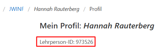 - Die Lehrperson-ID muss der Lehrkraft, die hinzugefügt werden soll, im eigenen Profil nachschlagen: unter dem Namen im Bereich „Profilinfos“. Sie ist eine 6-stellige Zahl.