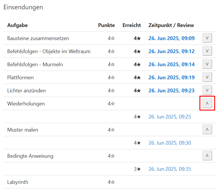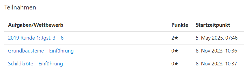 - Klicken Sie in den „Teilnahmen“ auf einen Wettbewerb (z. B. Grundbausteine – Einführung).