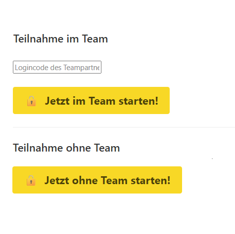 Damit zwei SuS in einem Team teilnehmen können benötigen sie beide einen Logincode. Sobald ein Wettbewerb ausgewählt wurde, kann der Wettbewerb entweder alleine im Bereich “Teilnahme ohne Team” über den Button “Jetzt ohne Team starten” gestartet werden, oder im Bereich “Teilnahme im Team”. Dafür muss Der erste SuS bereits auf jwinf.de eingeloggt sein und nun den Logincode des zweiten SuS im Feld “Logincode des Teampartners” eintragen. Mit “Jetzt im Team starten” kann dann der Wettbewerb gestartet werden. Die Teilnahme wird dann für beide Accounts angezeigt und gewertet.